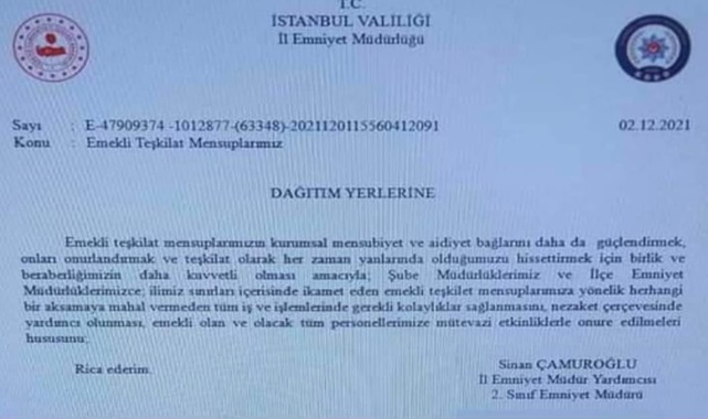 İl Emniyet Müdürü Zafer Aktaş'ın talimatı uyarınca İl Emniyet Müdür Yardımcısı Sinan Çamuroğlu'nun imzasını taşıyan bağlı birimlere gereğinin yapılması talimatıyla iletilen 02.12.2021 tarihli " Emekli Teşkilat Mensuplarımız " başlıklı talimat yazısında şu ifadeler yer aldı :