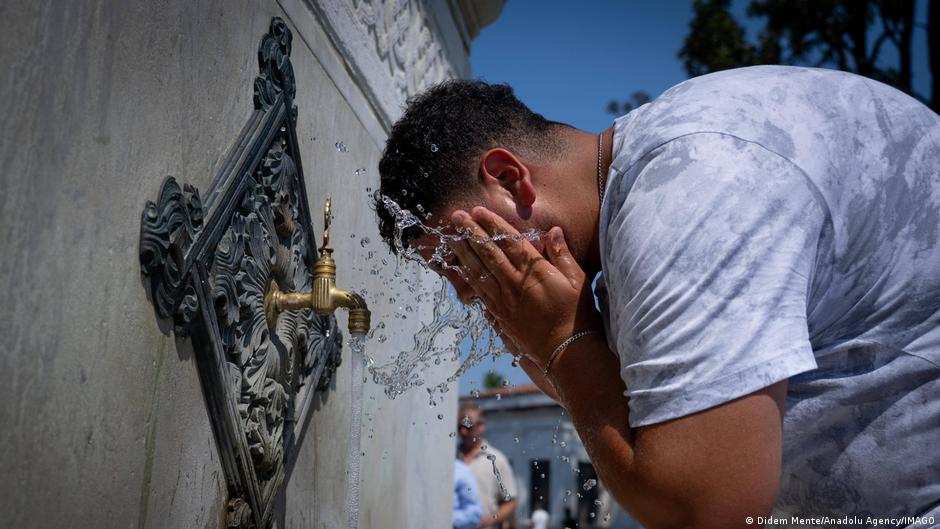 İstanbul'da çeşmeden akan su ile serinlemeye çalışan bir kişiFotoğraf: Didem Mente/Anadolu Agency/IMAGO